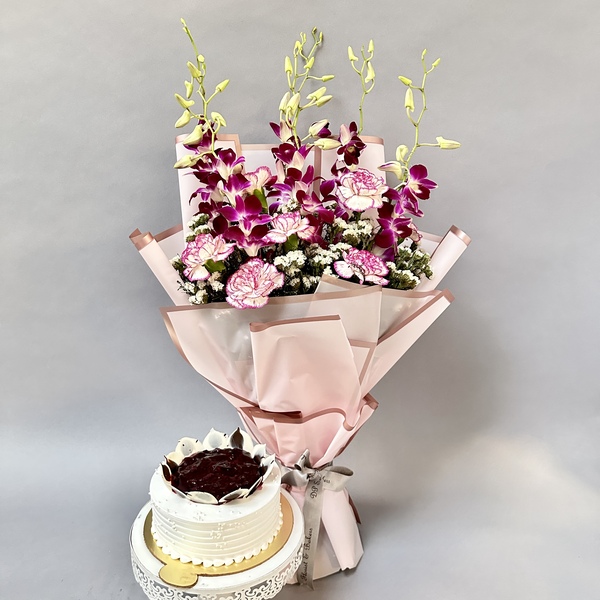 Premium Belgian chocolate cakes are rich and luxurious. Pairing them with orchids creates a sophisticated and stylish anniversary gift.