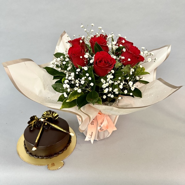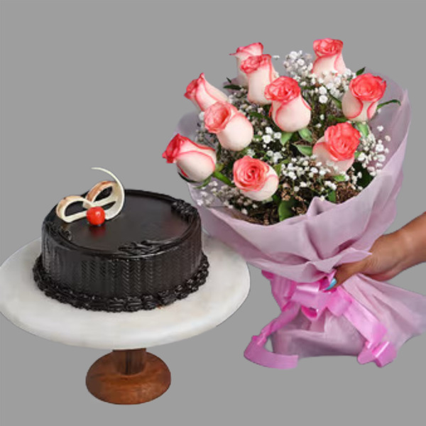A rich chocolate truffle cake paired with fresh red roses is the ultimate romantic gift. The smooth ganache texture and deep chocolate flavour make it ideal for couples who love classic choices.